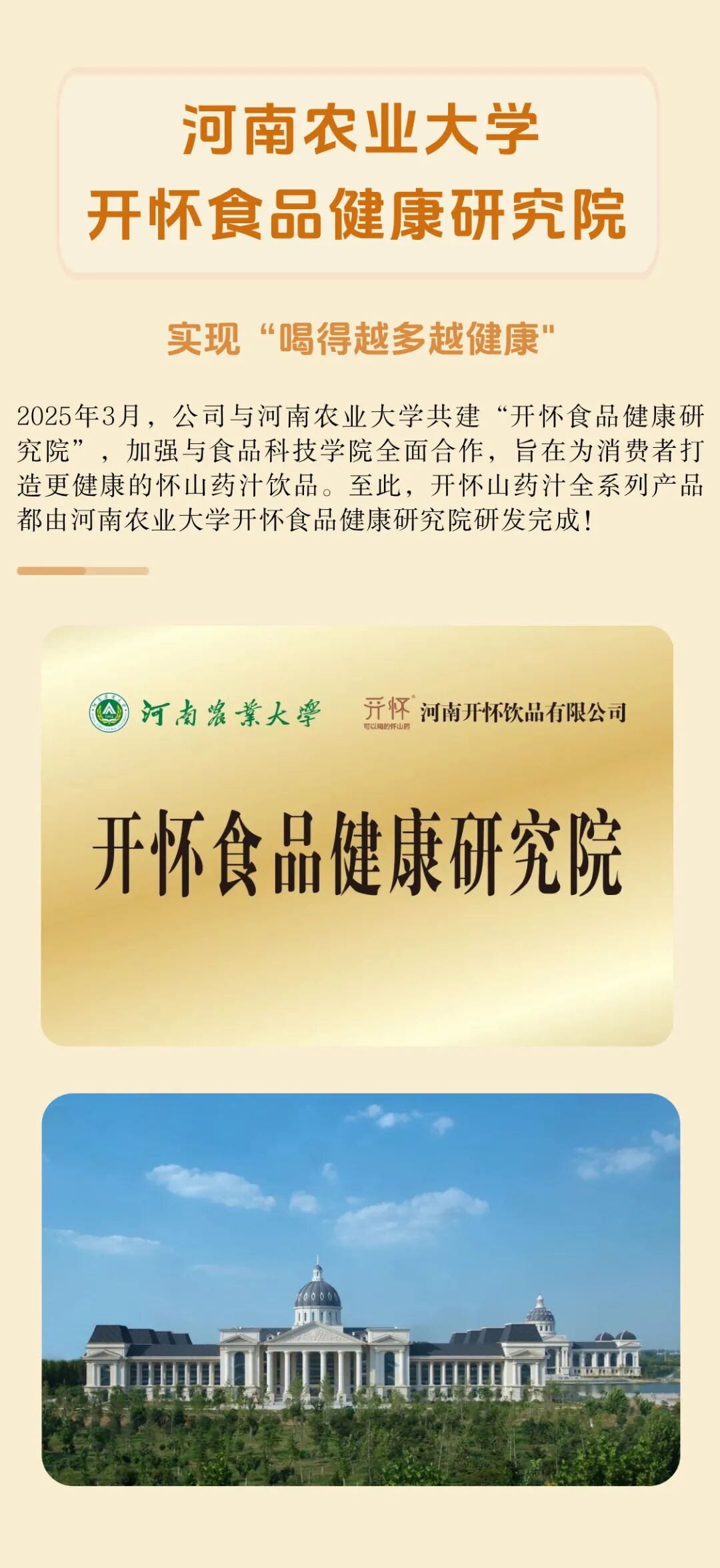 公司与河南农业大学共建“开怀食品健康研究院”,加强与食品科技学院全面合作,旨在为消费者打造更健康的怀山药汁饮品。至此,开怀山药汁全系列产品都由河南农业大学开怀食品健康研究院研发完成!