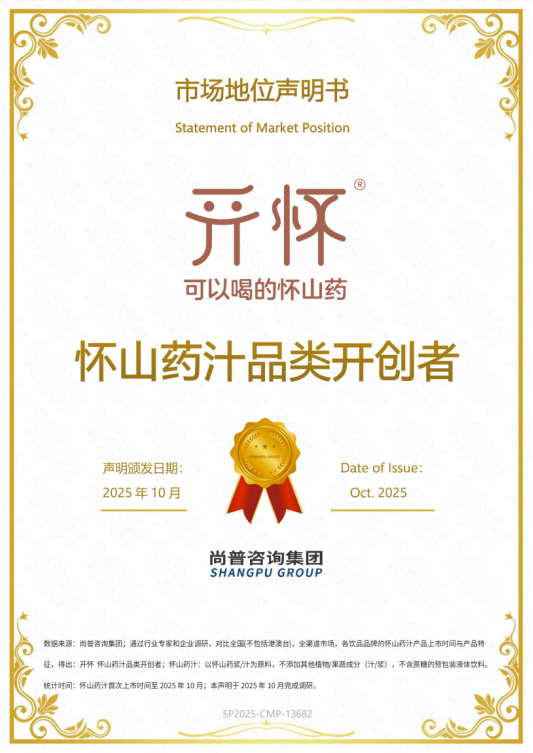 与此同时,品牌发展再添权威背书:2025年10月10日,开怀山药汁正式获权威认证机构“尚普咨询”授予“中国怀山药汁品类开创者”市场地位认证!