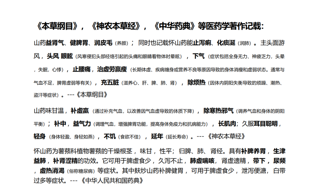 这种“普惠性”,早在典籍中便有印证。《神农本草经》称其“味甘性温,主伤中,补虚羸,除寒热邪气,补中益气,长肌肉”,更直言“久服耳目聪明,轻身不饥,延年”;《本草纲目》进一步细化其功效:“益肾气,健脾胃,止泻痢,化痰涎,润皮毛”;药王孙思邈用它入屠苏酒,在瘟疫横行的年代里护一方平安;近代名医张锡纯更将其奉为“救急圣药”,或单煮薯蓣粥温补虚损,或配伍其他药材急救危症……从治病到养生,从宫廷到民间,怀山药用十几种明确的功效、“无过量之忧”的温和属性,在中国人的养生图谱中刻下了不可替代的位置。