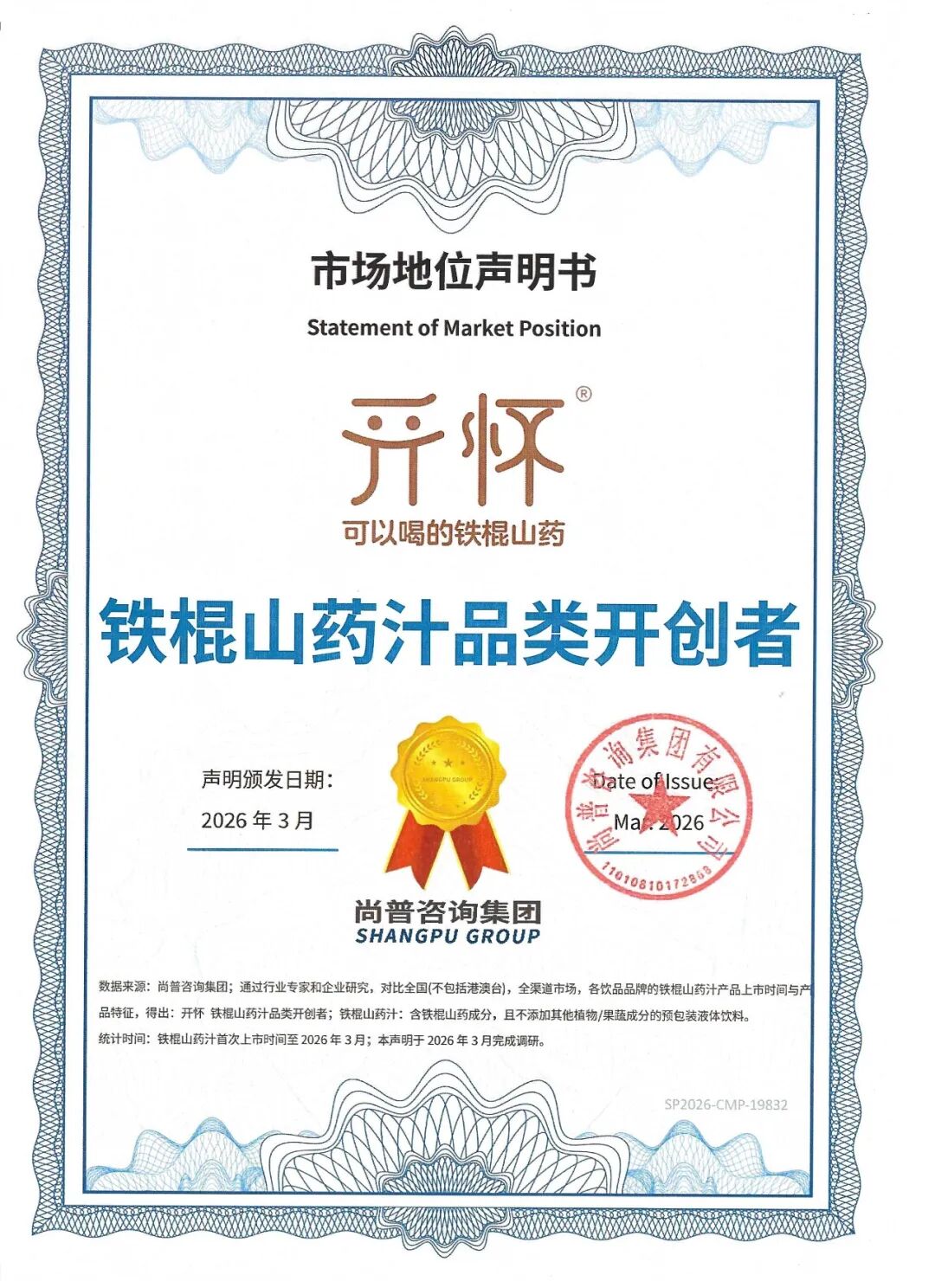 2026年3月,开怀铁棍山药汁凭借其在市场上的卓越表现,获得由权威认证机构尚普咨询集团颁发的【开怀·铁棍山药汁品类开创者】市场地位认证。该认证基于尚普咨询在全国范围内对全渠道铁棍山药汁品牌上市时间与创新情况的调研分析,数据客观、真实,具有较强说服力。这不仅是对开怀品牌创新实力的高度认可,也标志着中国饮品行业一个全新细分品类——铁棍山药汁的正式诞生。